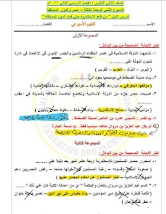- حل التقييم الاسبوعي للصف الثاني الثانوي تاريخ