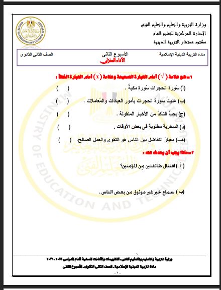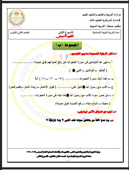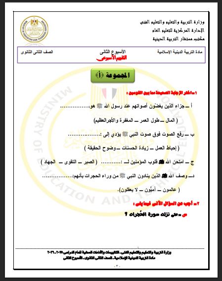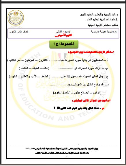 - الأسبوع الثاني تقييم ثانية ثانوي التربية الاسلامية