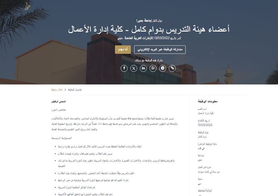 لمطالعة نص إعلان وظيفة جامعة جميرا والتقديم اضغط هنا