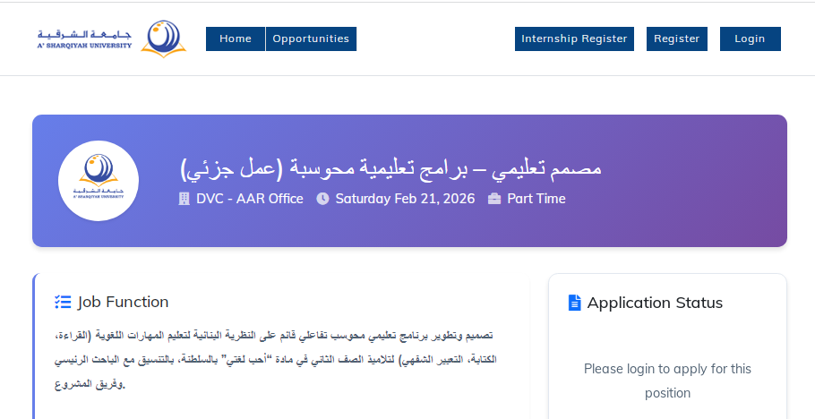 وظيفة جامعة.. أعلنت جامعة الشرقية عن توفر وظيفة بدوام جزئي بمسمى مصمم تعليمي – برامج تعليمية محوسبة، وذلك ضمن مكتب نائب الرئيس للشؤون الأكاديمية والبحث العلمي DVC - AAR Office، بتاريخ السبت 21 فبراير 2026، في إطار تنفيذ مشروع بحثي لتطوير برنامج تعليمي تفاعلي موجه لتلاميذ الصف الثاني في مادة “أحب لغتي” بسلطنة عمان.