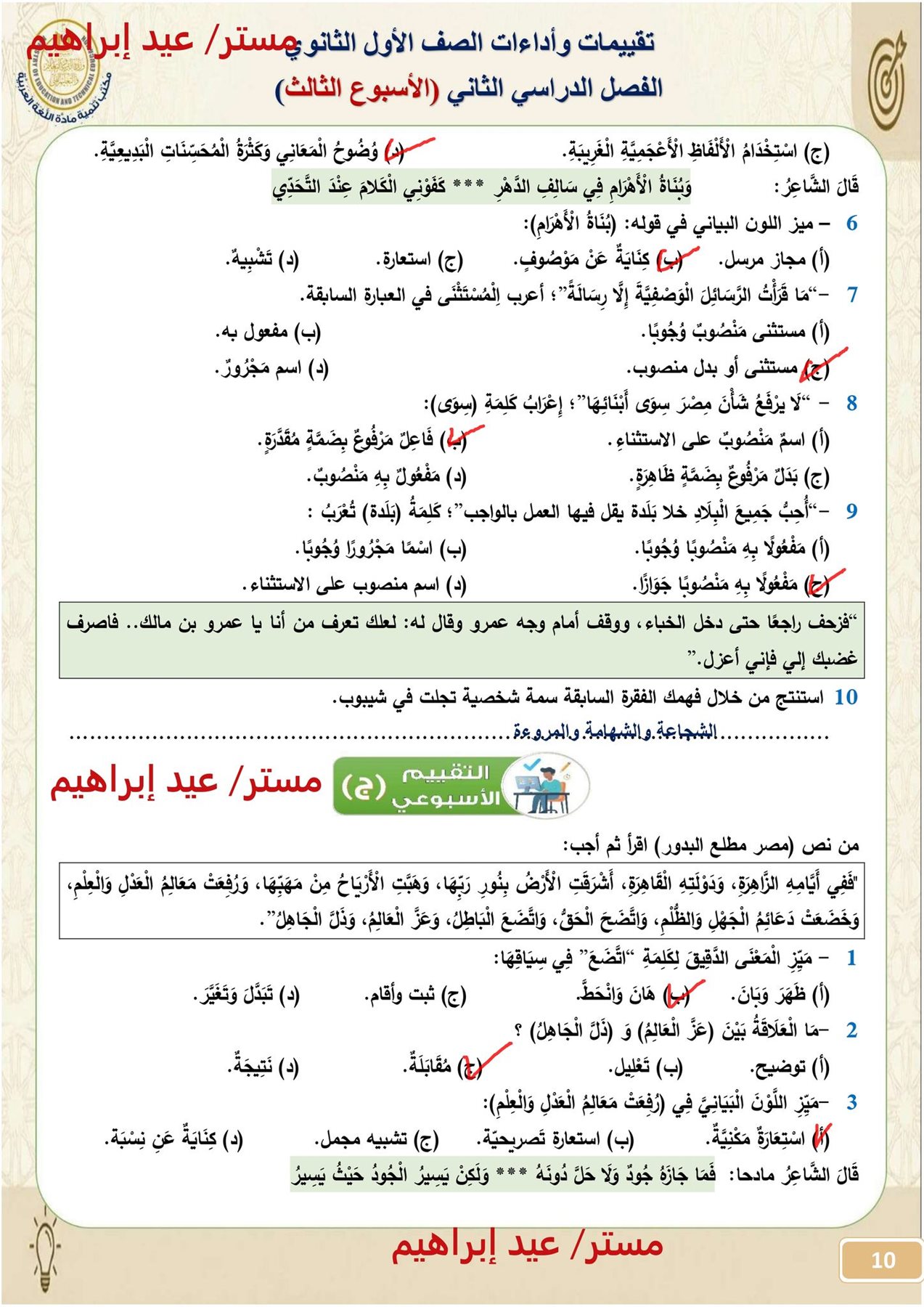 - امتحان عربي أولى ثانوي الأسبوع الثالث الترم الثاني