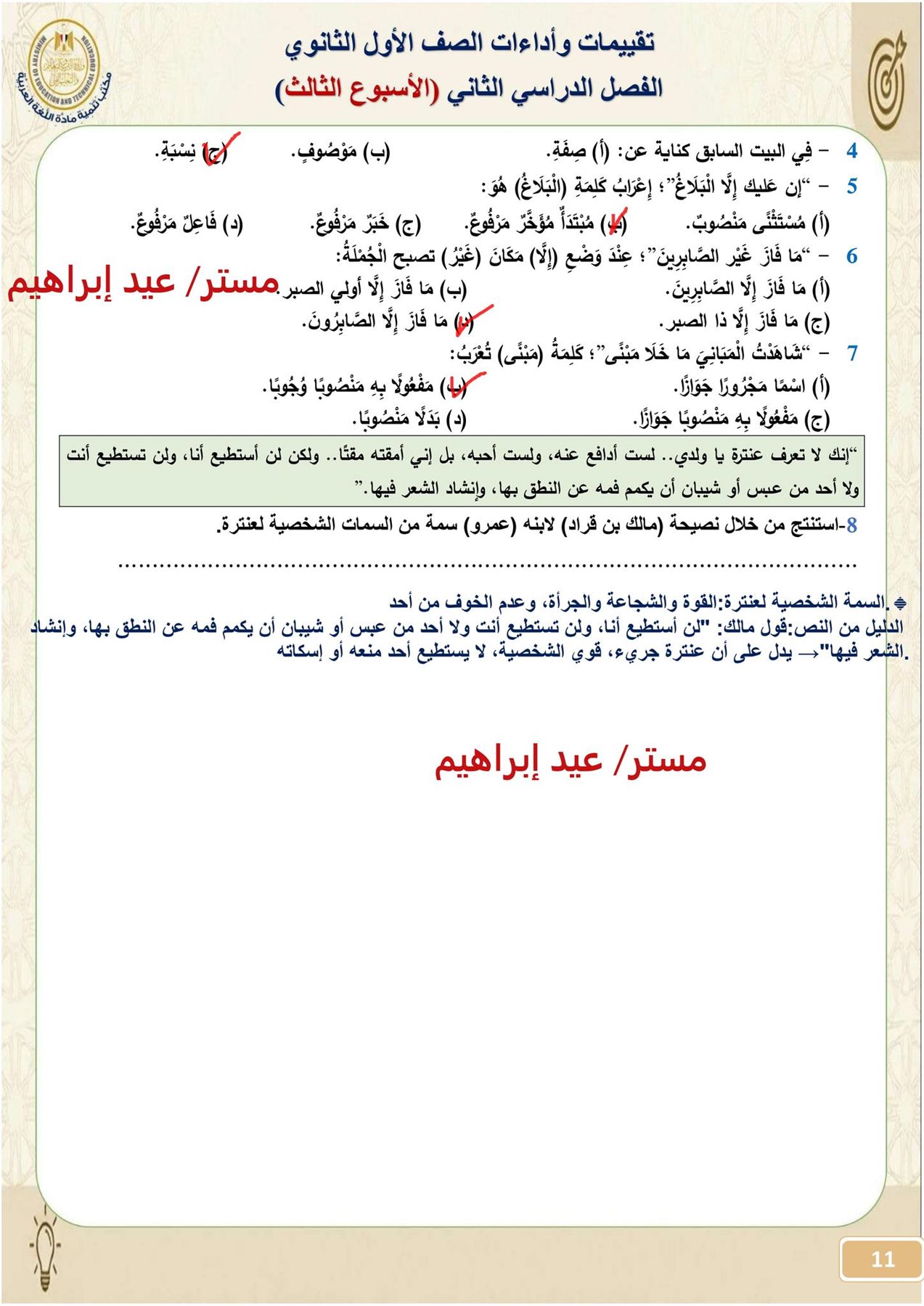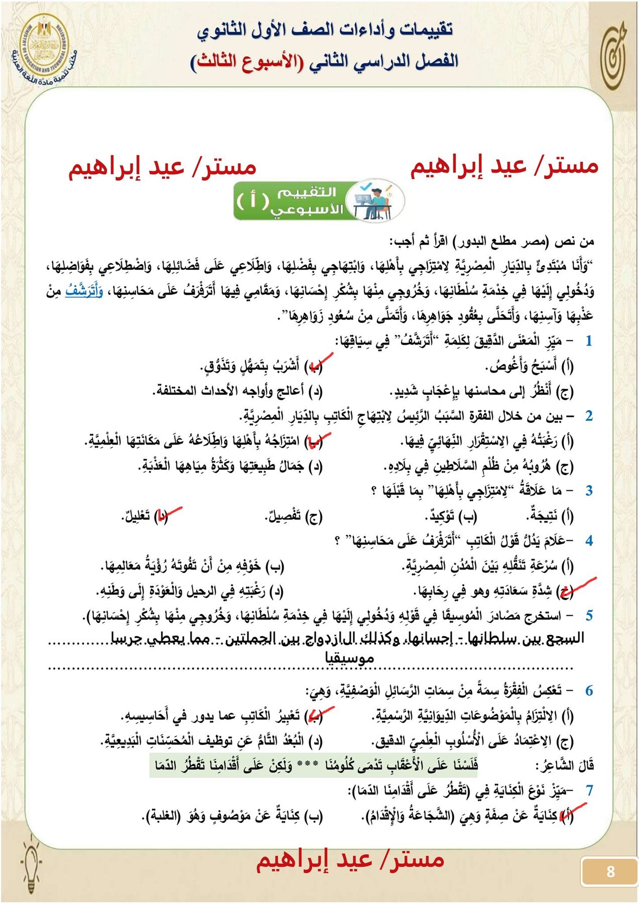 - تقييمات اللغة العربية أولى ثانوي الترم الثاني 2026