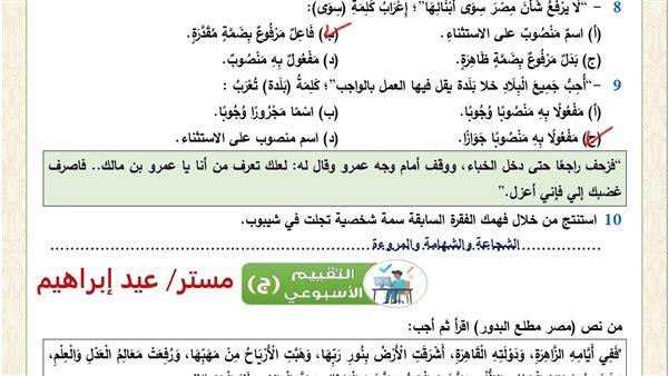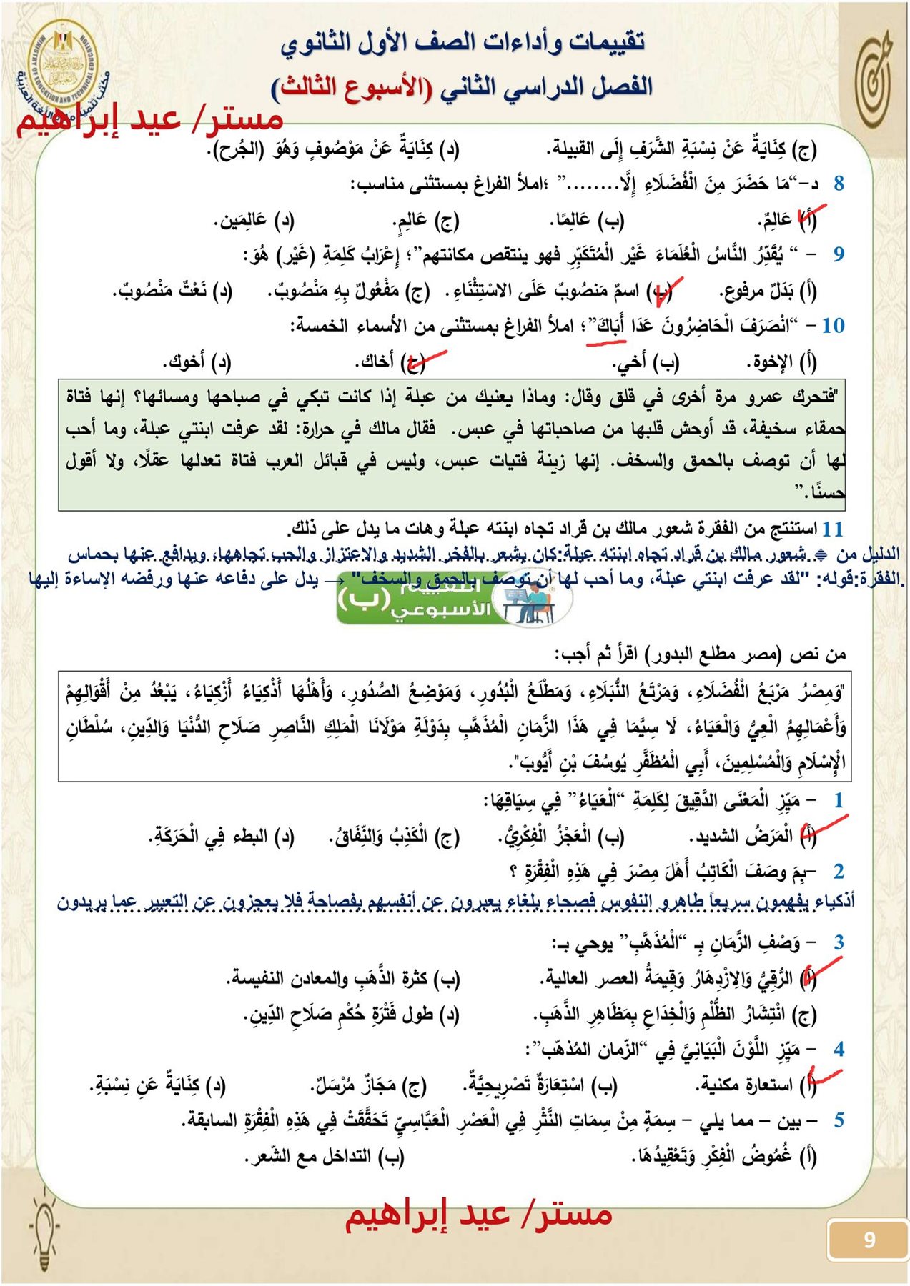 - تقييمات وزارة التربية والتعليم أولى ثانوي عربي