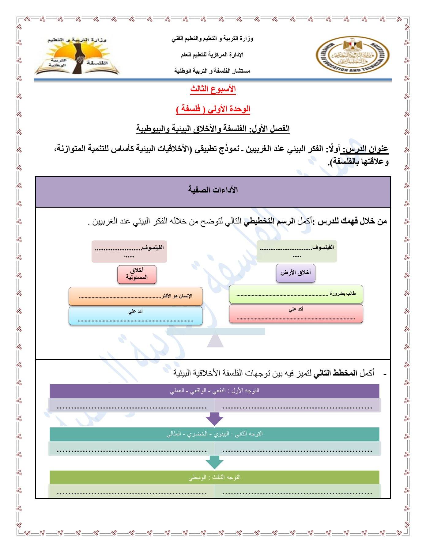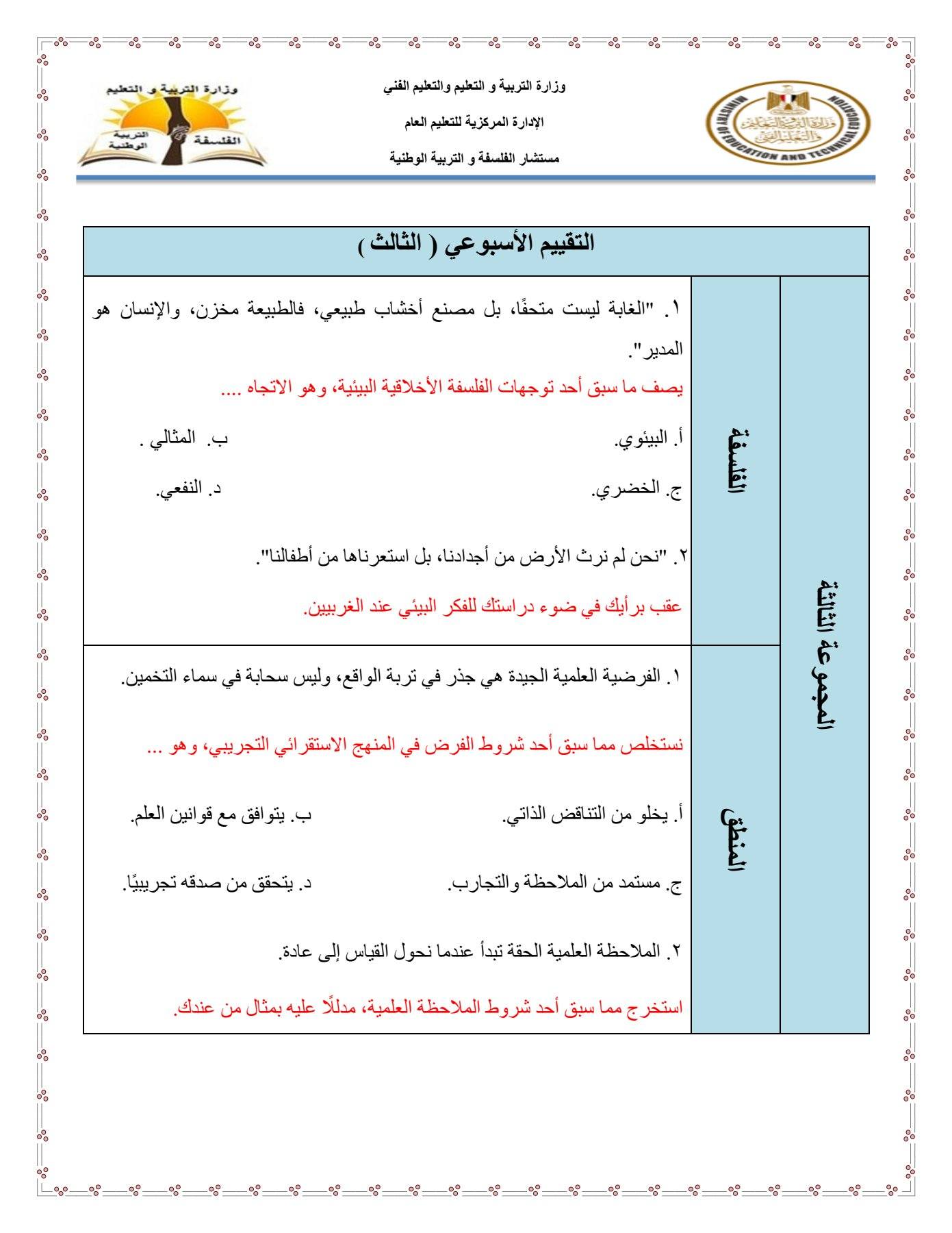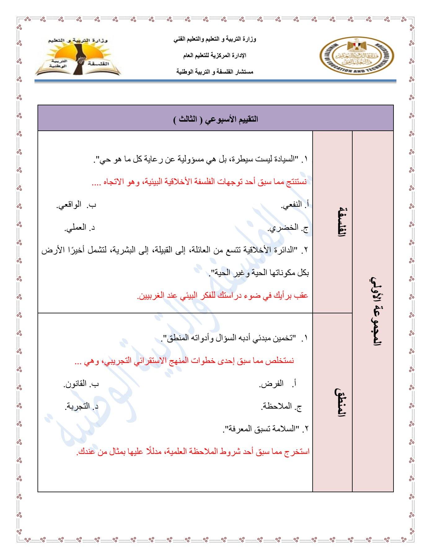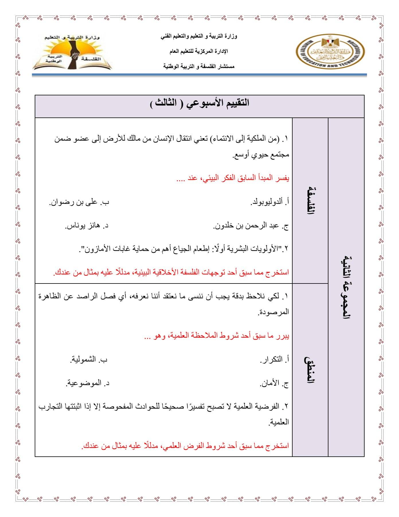 - التقييم الاسبوعي للصف الأول الثانوي الفلسفة والمنطق