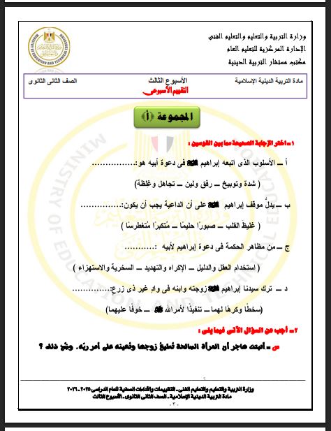 - الأسبوع الثالث تقييم ثانية ثانوي التربية الاسلامية
