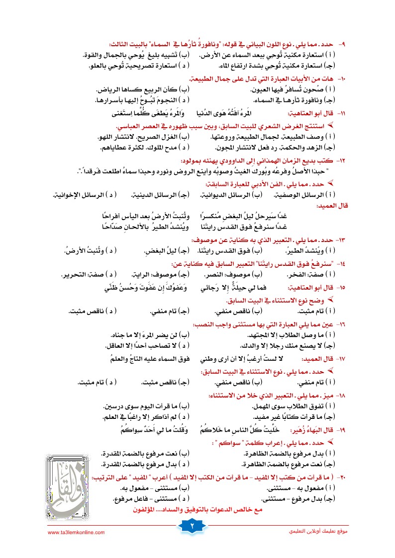 - امتحان اللغة العربية عن مقرر شهر فبراير بالاجابات