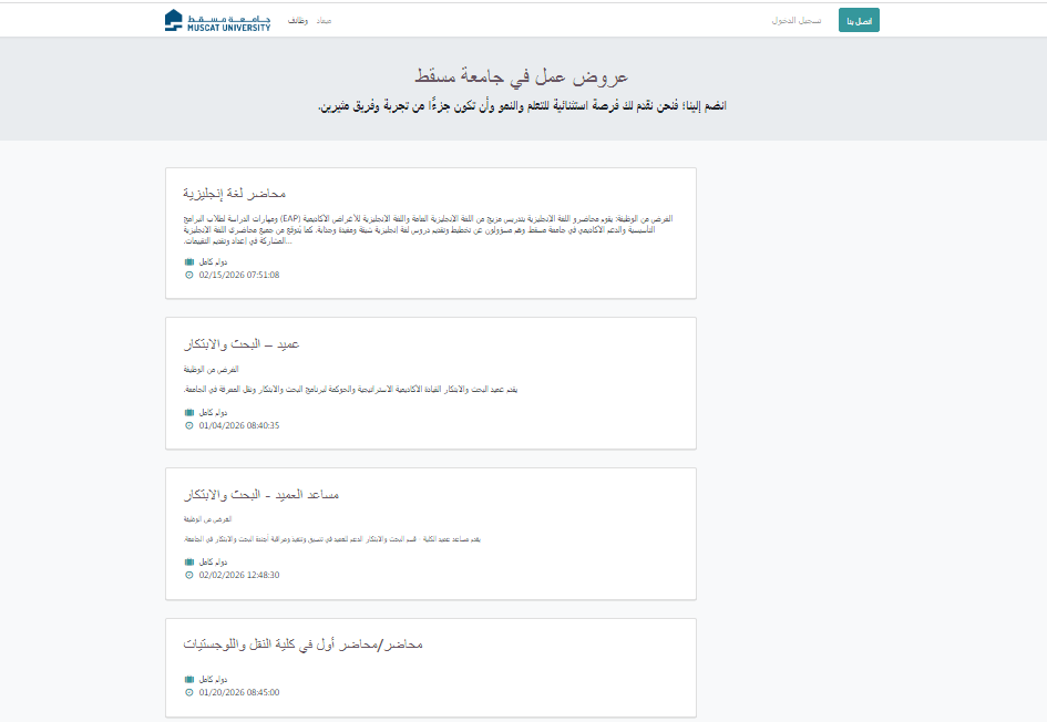 وتعكس هذه الوظائف توجه جامعة مسقط نحو تعزيز البحث العلمي، وتحقيق التميز الأكاديمي، وتوسيع الشراكات الدولية، بما يرسخ مكانتها كمؤسسة تعليمية رائدة في سلطنة عُمان والمنطقة.