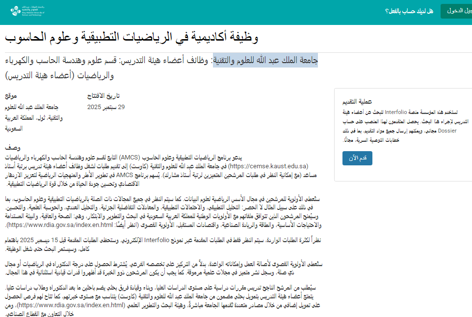 لمطالعة نص إعلان وظيفة جامعة الملك عبد الله والتقديم اضغط هنا