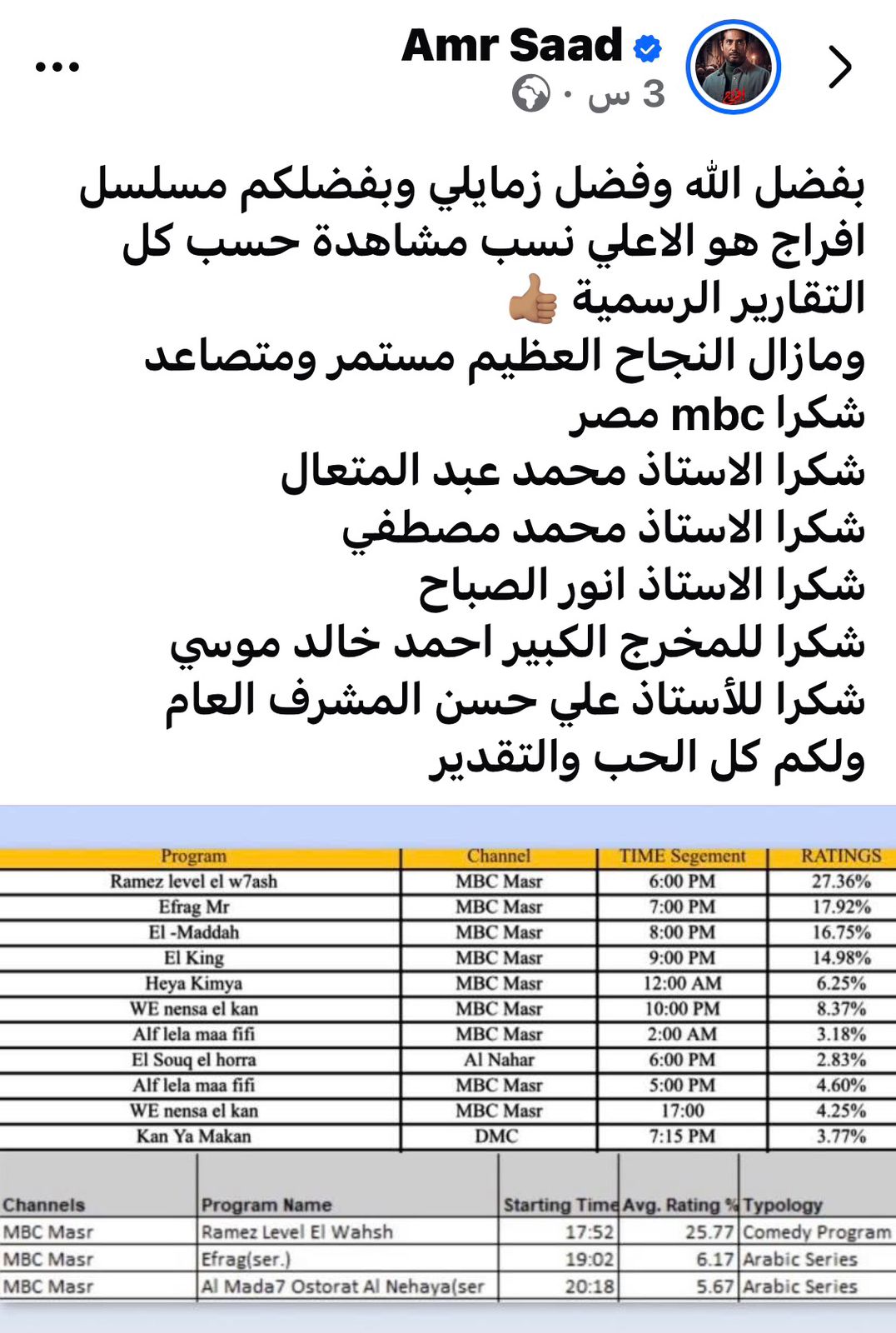 عمرو سعد يحتفل بصدارة مسلسل إفراج ويتحدى بتقارير رسمية