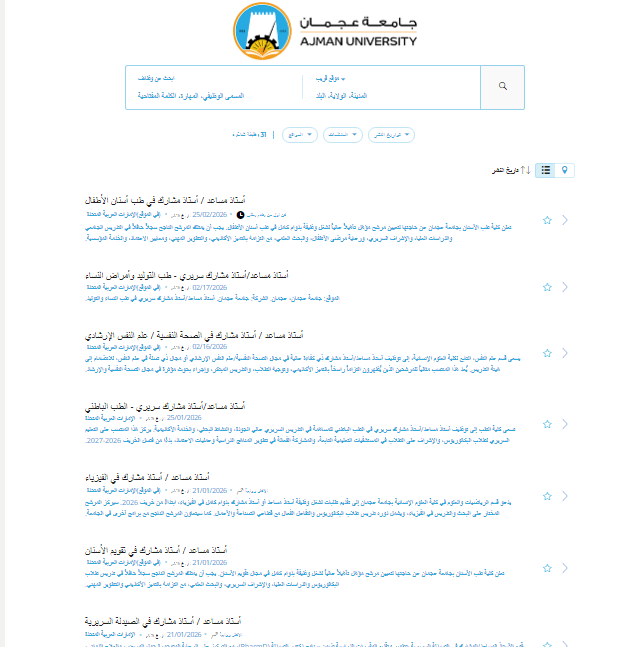 وظيفة جامعة.. أعلنت جامعة عجمان عن فتح باب التقديم لعدد كبير من الوظائف الأكاديمية والقيادية للعام الجامعي 2026-2027، في مختلف الكليات والتخصصات، وذلك ضمن خطتها لتعزيز الكفاءات التعليمية والبحثية ودعم الاعتماد الأكاديمي والتميز المؤسسي داخل دولة الإمارات العربية المتحدة.