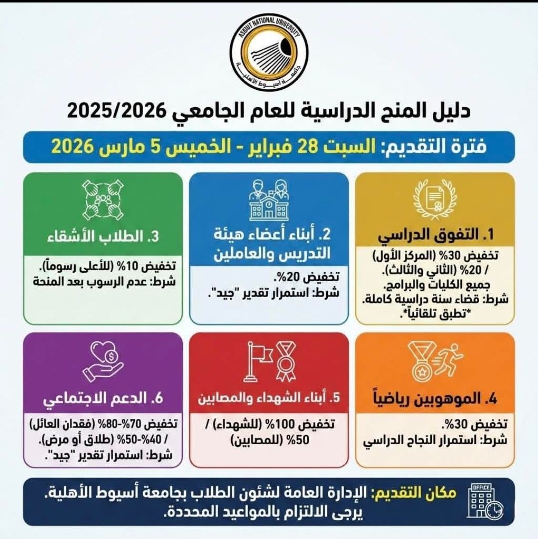 وأكدت جامعة أسيوط الأهلية أن هذه المنح تأتي ضمن استراتيجية تطوير منظومة المنح الدراسية الجامعية وتشمل مسارات متنوعة لدعم الطلاب في المجالات الأكاديمية والرياضية والاجتماعية.
