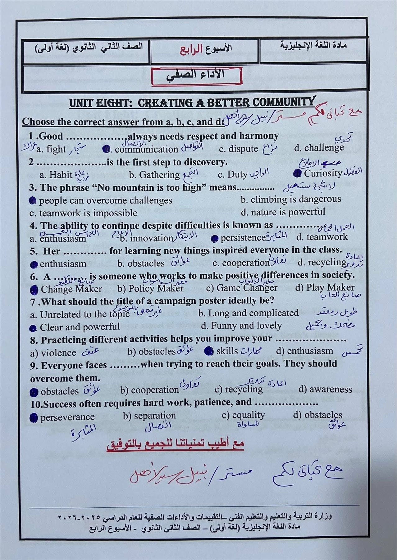 أسئلة تقييمات الأسبوع الرابع إنجليزي بالاجابات أولى ثانوي ترم ثاني