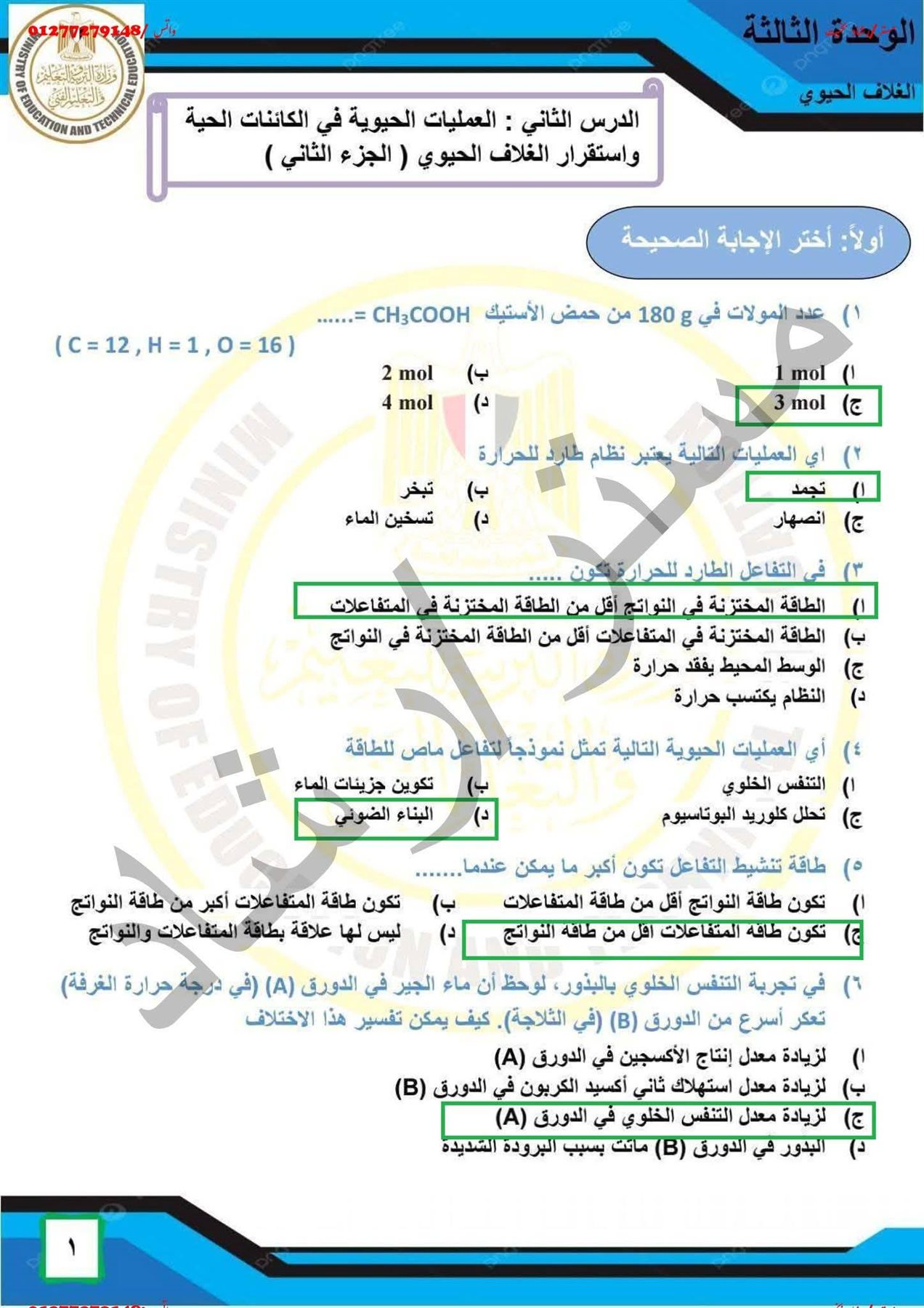 - حل التقييم الاسبوعي للصف الأول الثانوي احياء