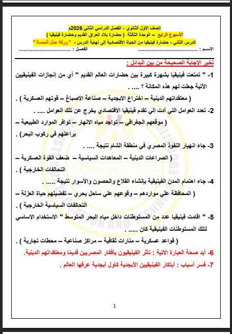 أولًا: حل ورقة التاريخ (الصف الأول الثانوي)