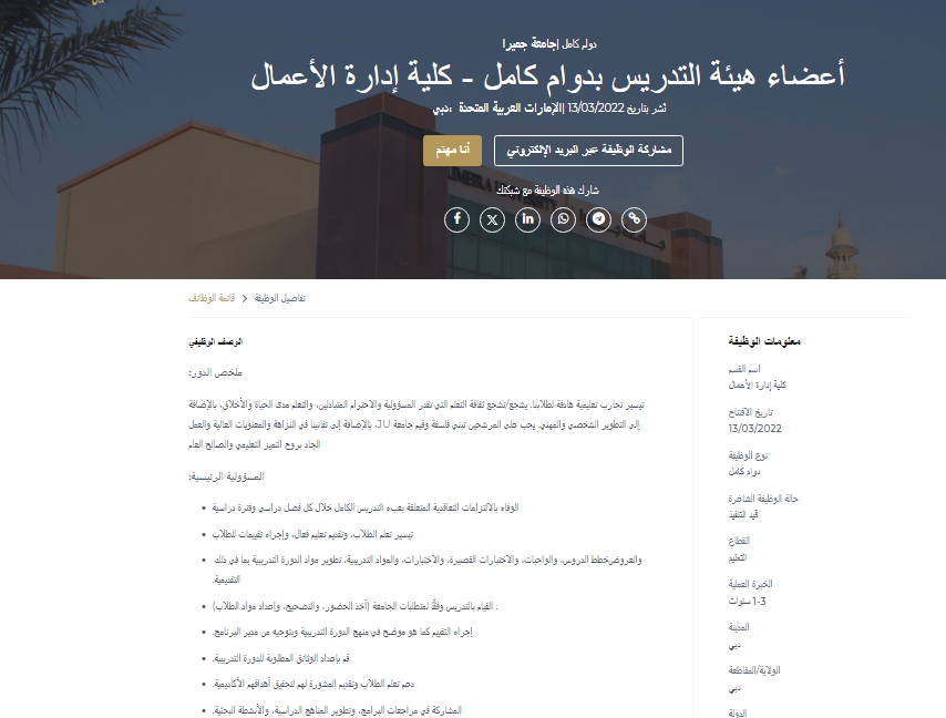 وظيفة جامعة.. وظائف أعضاء هيئة التدريس بجامعة جميرا.. قدم الآن