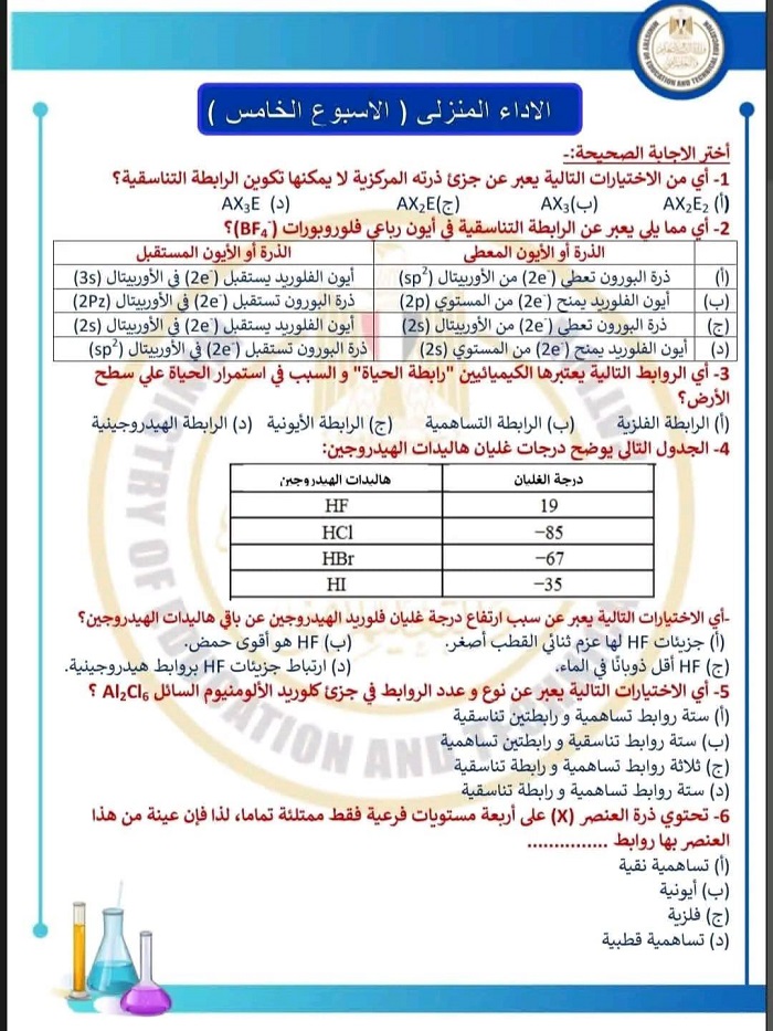 - الأسبوع الخامس تقييم ثانية ثانوي الكيمياء