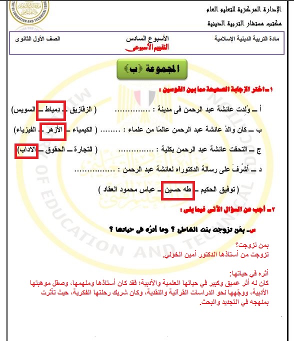 - إجابات تقييم الأسبوع السادس تربية إسلامية الصف الأول الثانوي ترم ثاني