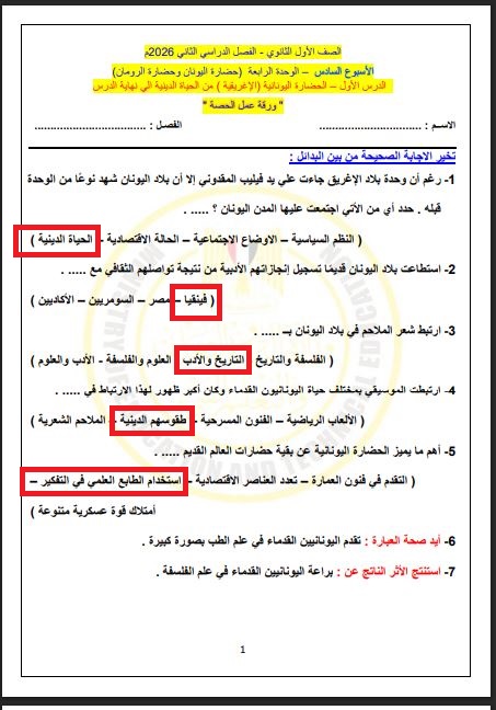 لطلاب اولى ثانوي.. بالإجابات تقييم الأسبوع السادس التاريخ ترم ثاني