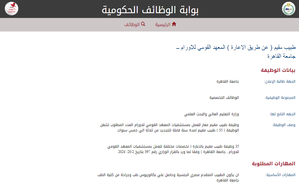 وظيفة جامعة.. أعلن جامعة القاهرة ممثلة في المعهد القومي للأورام عن فتح باب التقديم لشغل وظائف أطباء مقيمين بنظام الإعارة للعمل داخل مستشفيات المعهد، وذلك في إطار دعم المنظومة الصحية وتطوير الخدمات الطبية المتخصصة في علاج الأورام.