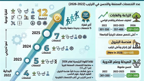الزراعة والغابات: قفز التخصص بشكل ملحوظ ليصل إلى الفئة (201–250) عالميًا، محققًا تقدمًا كبيرًا عن العام الماضي.