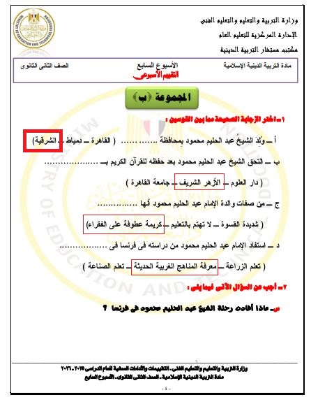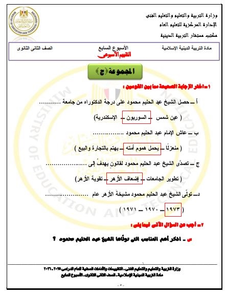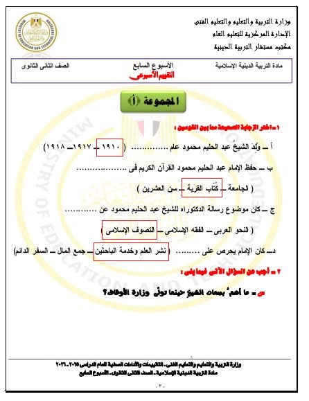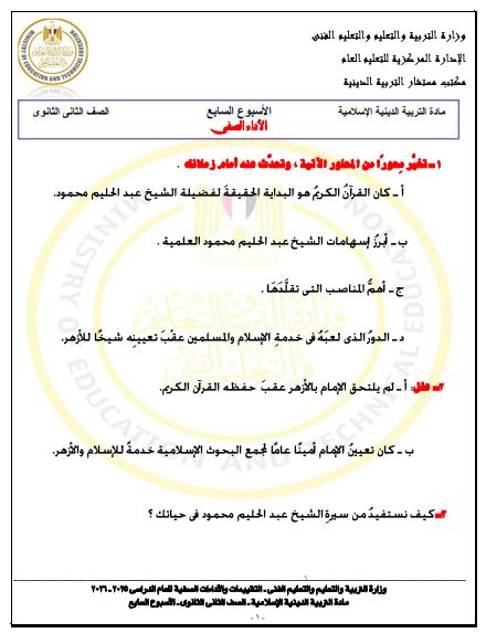 - نموذج الإجابات في تقييم الأسبوع السابع التربية الإسلامية ترم ثاني ثانية ثانوي