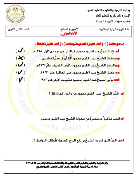 - حل تقييم الأسبوع السابع تربية إسلامية ثانية ثانوي