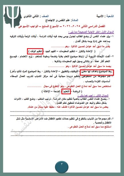 أسئلة وإجابات الأسبوع السابع علم النفس.. شهدت محركات البحث خلال الأيام الأخيرة ارتفاعًا ملحوظًا في عمليات البحث عن حل أسئلة تقييم الأسبوع السابع في مادة علم النفس والاجتماع للصف الثاني الثانوي ترم ثاني 2026، مع اقتراب الامتحانات الشهرية ورغبة الطلاب في مراجعة الدروس بشكل شامل والتأكد من صحة الإجابات.