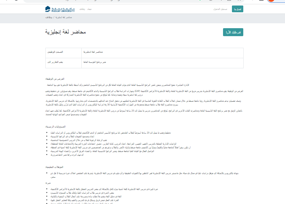 وظيفة جامعة.. أعلنت جامعة مسقط عن فتح باب التقديم لشغل وظيفة محاضر لغة إنجليزية، ضمن برامجها التأسيسية، في إطار سعيها لتعزيز جودة التعليم ودعم مهارات الطلاب الأكاديمية واللغوية بما يتماشى مع متطلبات الدراسة الجامعية.