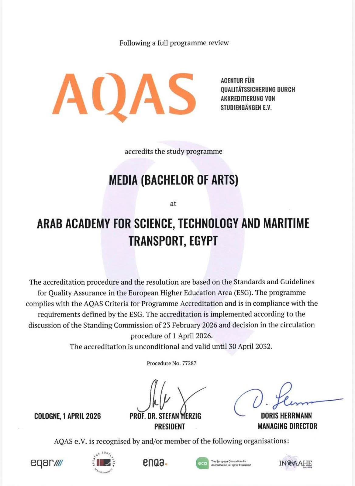 وجاء قرار الهيئة الألمانية بمنح الاعتماد الدولي غير المشروط للبرنامج تأكيدا على التزام الأكاديمية العربية للعلوم والتكنولوجيا والنقل البحري بمعايير الجودة الأوروبية المعروفة اختصارا باسم ESG.
