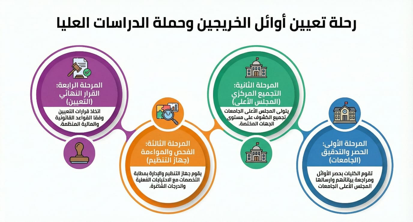 4 مراحل لتعيين أوائل الكليات وحملة الماجستير والدكتوراه..انفوجراف