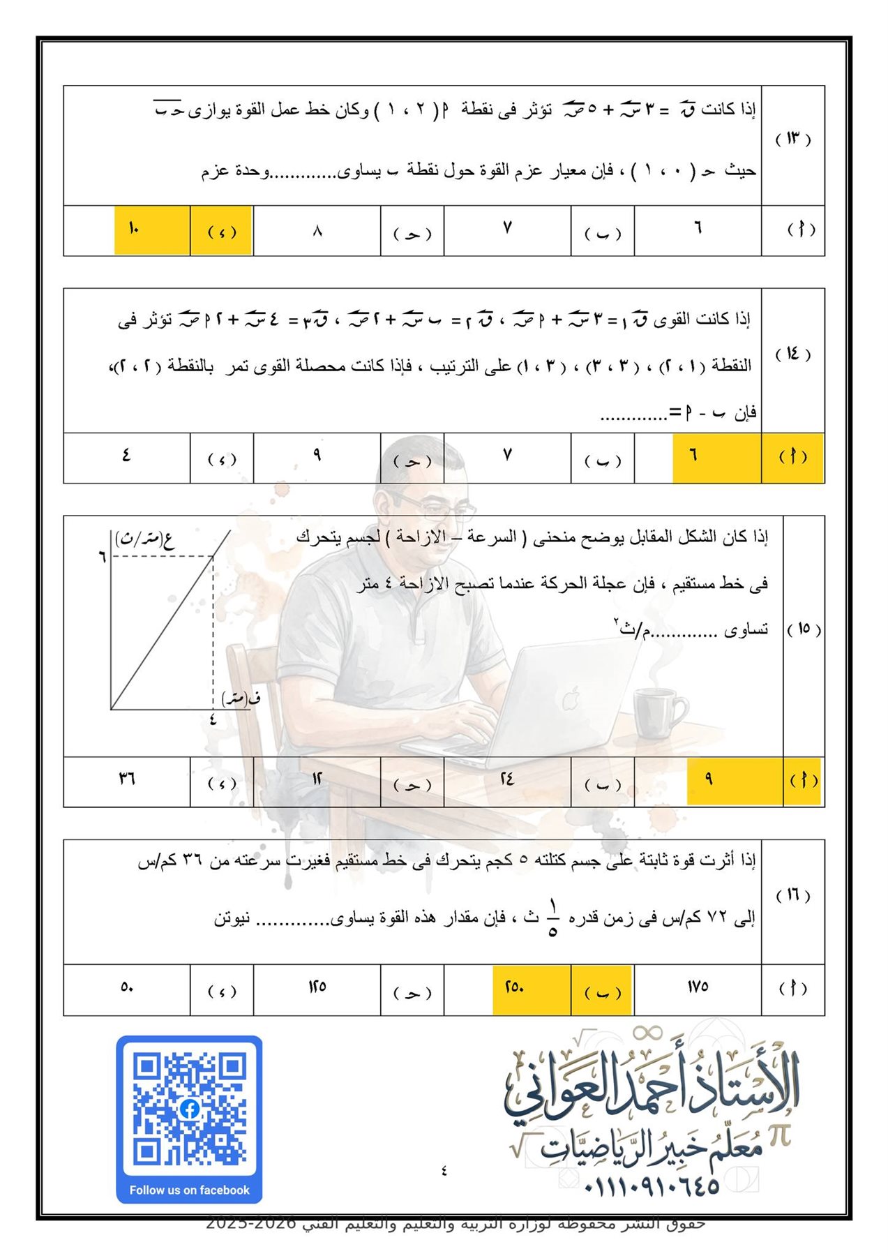 إجابة النموذج الاسترشادي الرابع في الرياضيات التطبيقية.. جاءت إجابة النموذج الاسترشادي الرابع شاملة لكافة الأسئلة، حيث تضمنت مسائل في فروع الرياضيات التطبيقية المختلفة مثل الاستاتيكا والديناميكا، مع الاعتماد على خطوات الحل المنظمة التي تساعد الطالب على فهم طريقة التفكير وليس مجرد الوصول إلى النتيجة.
