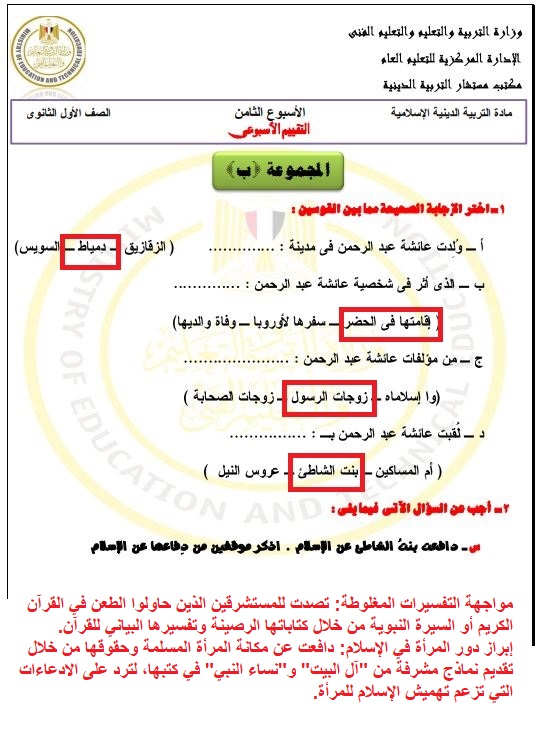 تقييم الأسبوع الثامن في التربية الإسلامية ترم ثاني.. وأشار خبراء التعليم إلى أن الإجابة النموذجية لا تعتمد فقط على الحفظ، بل على الفهم العميق للمفاهيم، خاصة في أسئلة “بم تفسر” و“ما النتائج المترتبة على”، والتي تحتاج إلى تنظيم الأفكار وكتابتها بشكل دقيق.