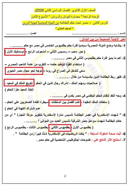 حل تقييم الأسبوع السابع في التاريخ أولى ثانوي ترم ثاني 2026.. مراجعة مهمة بالإجابات