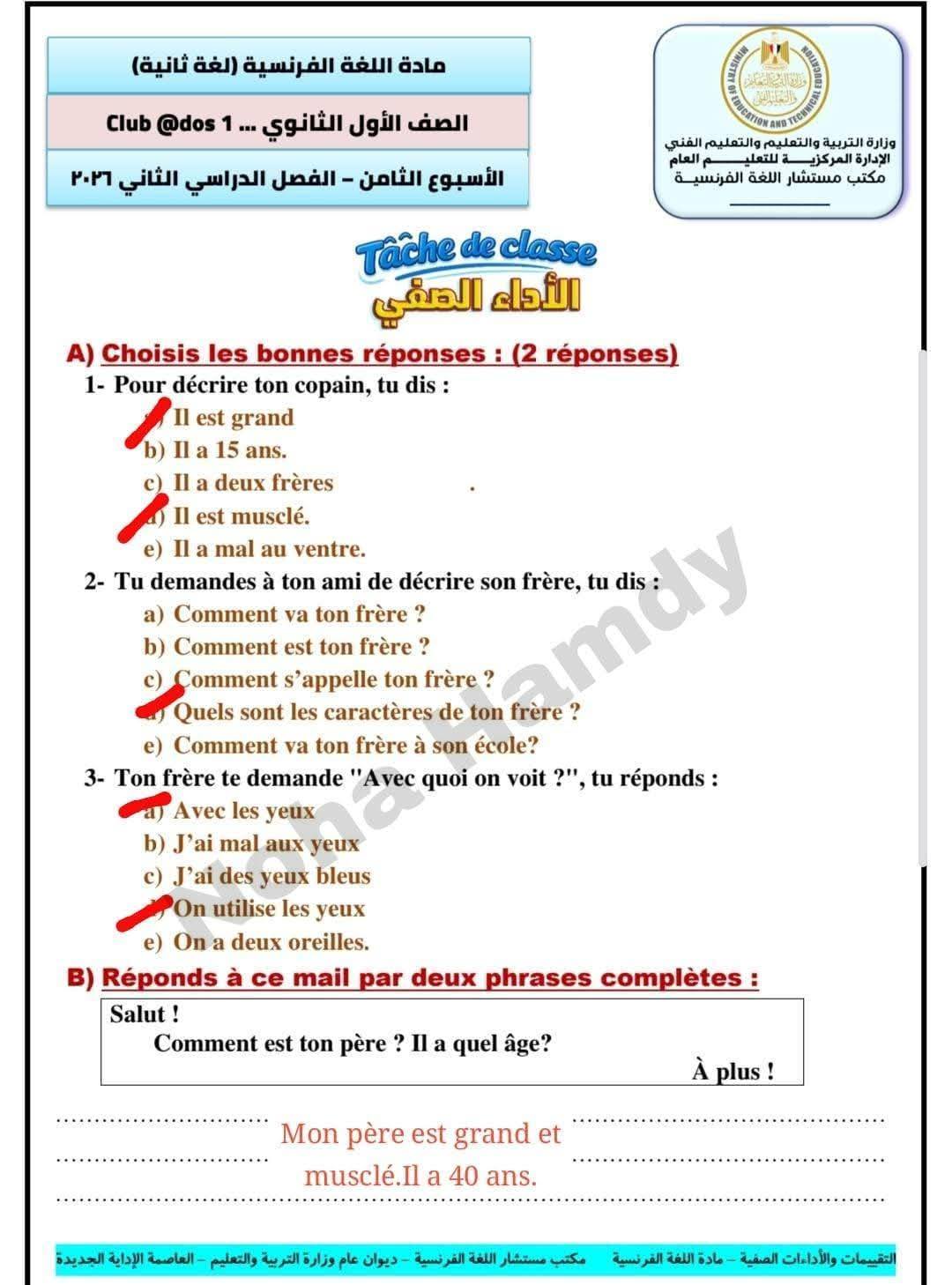 - إجابات تقييم الفرنساوي ترم ثاني 2026