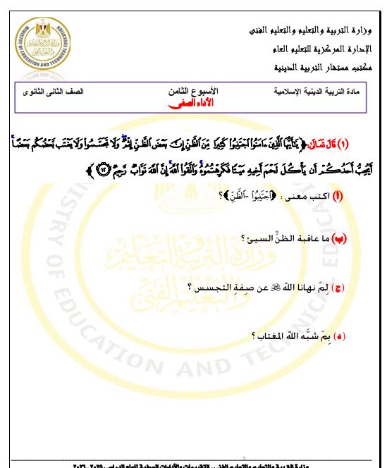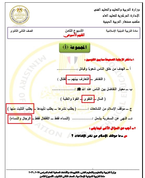 نموذج الإجابات في تقييم الأسبوع السابع التربية الإسلامية ترم ثاني ثانية ثانوي