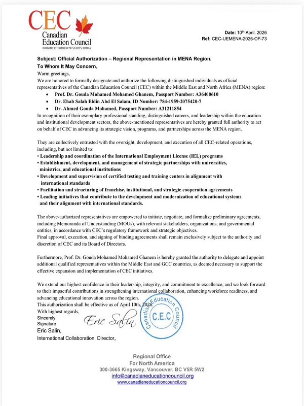 أعلن المجلس الكندي للتعليم (Canadian Education Council - CEC) عن خطوة استراتيجية جديدة تهدف إلى تعزيز التعاون الدولي في التعليم وتطوير النظم التعليمية في الشرق الأوسط وشمال أفريقيا، في إطار توسع عالمي يركز على دعم برامج التوظيف الدولية وبناء شراكات أكاديمية مؤثرة. ويأتي هذا التحرك من المجلس الكندي للتعليم ضمن خطة لرفع جودة التدريب والاعتماد المهني وفق المعايير الكندية.