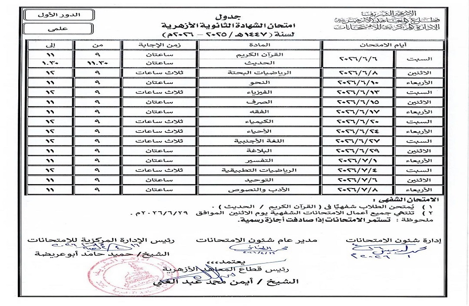 أما طلاب القسم العلمي، فمن المقرر أن تنطلق امتحاناتهم يوم السبت 6 يونيو 2026، أيضًا بمادتي القرآن الكريم والحديث الشريف، على أن تستمر حتى يوم الأربعاء 8 يوليو 2026، حيث تختتم الامتحانات بمادة الأدب والنصوص.