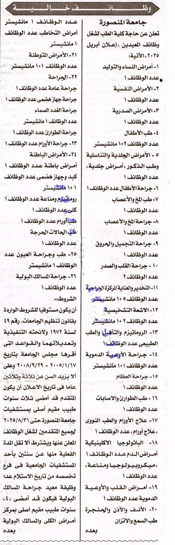 وظيفة جامعة.. تعلن جامعة المنصورة عن حاجتها إلى تعيين معيدين في 26 تخصصا من خريجي كلية الطب، وعلى الراغبين في الحصول على وظائف معيدين في جامعة المنصورة الدخول على موقع جامعة المنصورة عبر شبكة الانترنت، وذلك حسب الاعلان الذي تم نشره في جريدة الاخبار يوم الجمعة الموافق 17 أبريل الجاري.