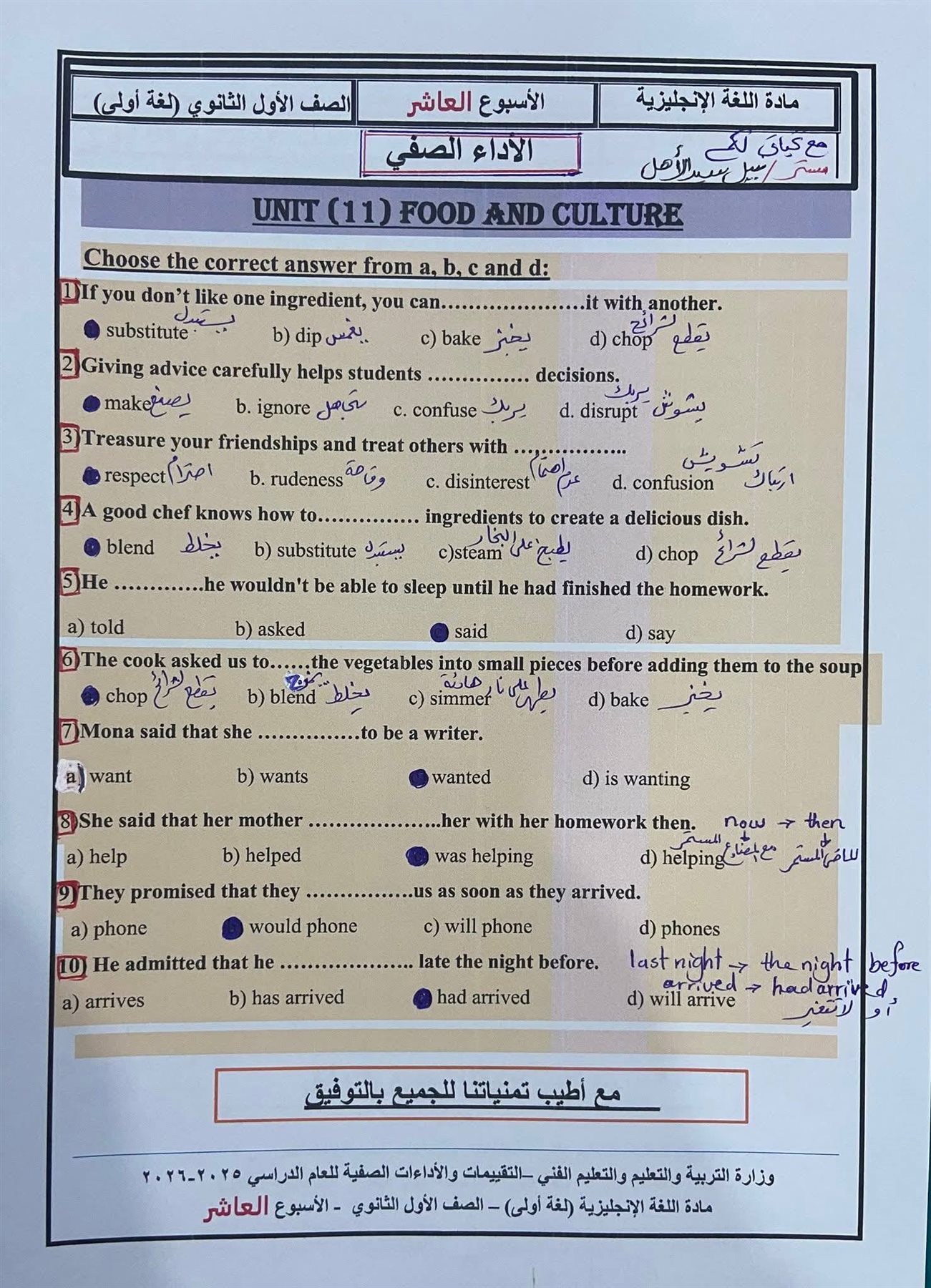 - تقييم الأسبوع العاشر إنجليزي أولى ثانوي