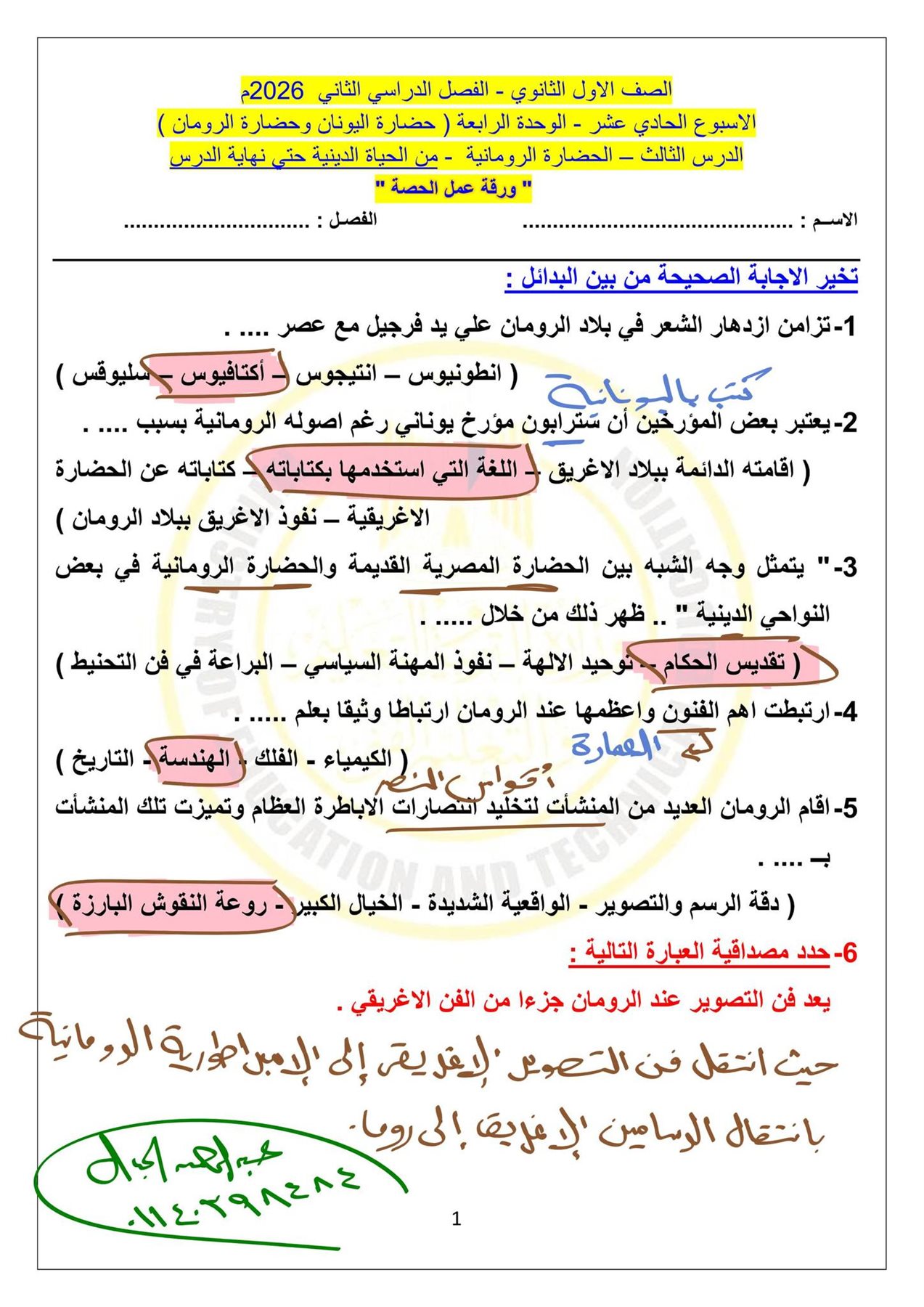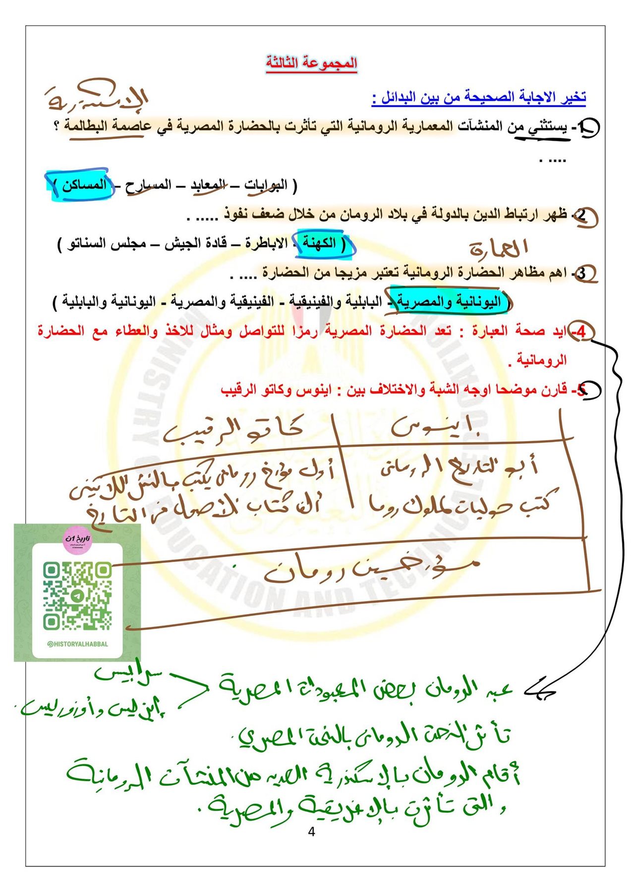 - تدريبات التاريخ الصف الأول الثانوي بالإجابات