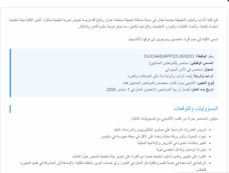 ويأتي هذا الإعلان في إطار حرص الجامعة على دعم منظومة التعليم العالي في سلطنة عمان، وتوفير بيئة تعليمية متطورة تجمع بين المعرفة النظرية والتطبيق العملي، داخل مقرها بمدينة صلالة التي تُعد واحدة من أبرز المدن الحيوية في البلاد.