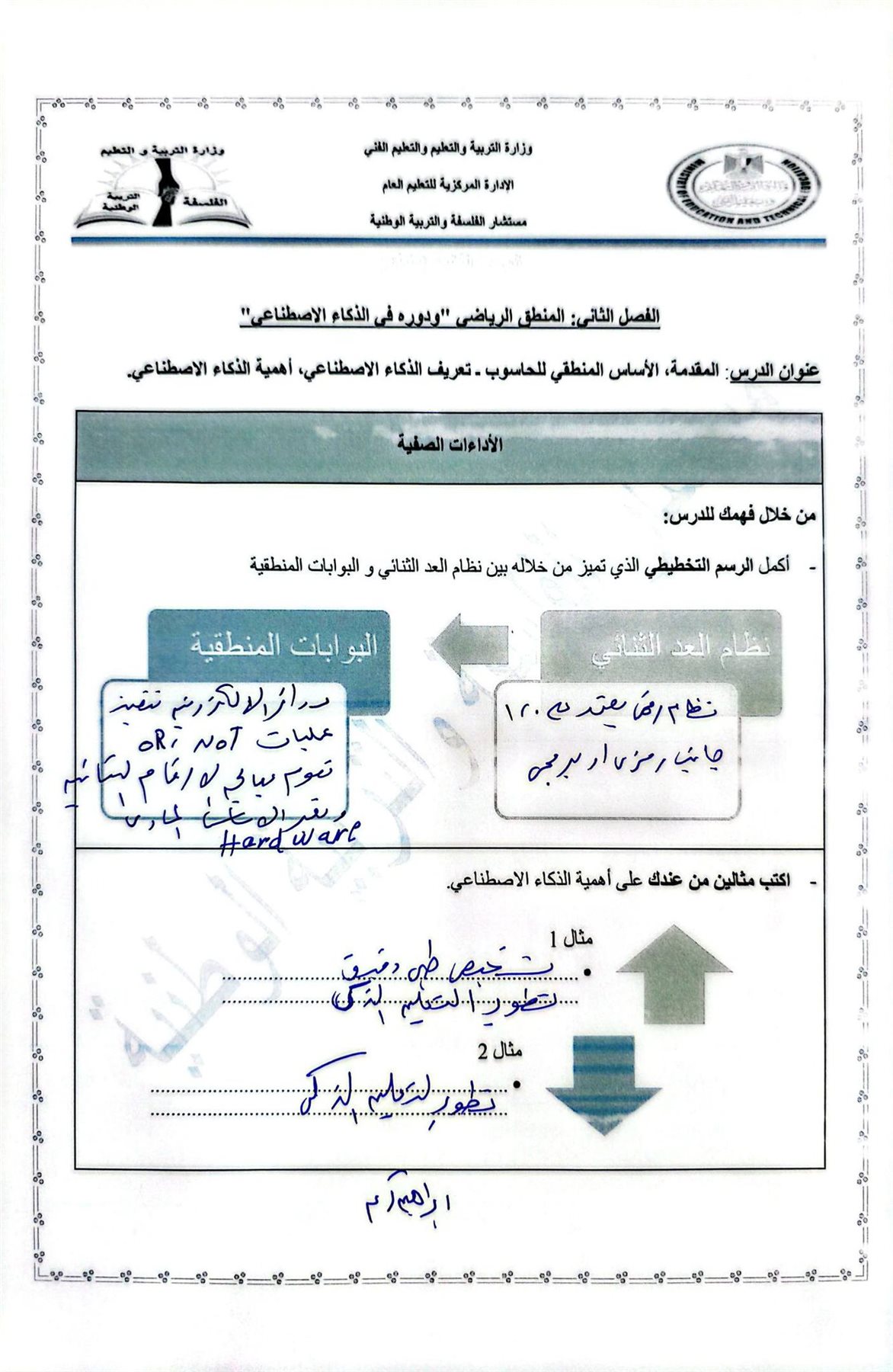 - التقييم الاسبوعي للصف الأولى الثانوي الفلسفة والمنطق