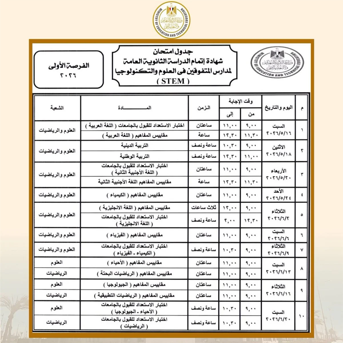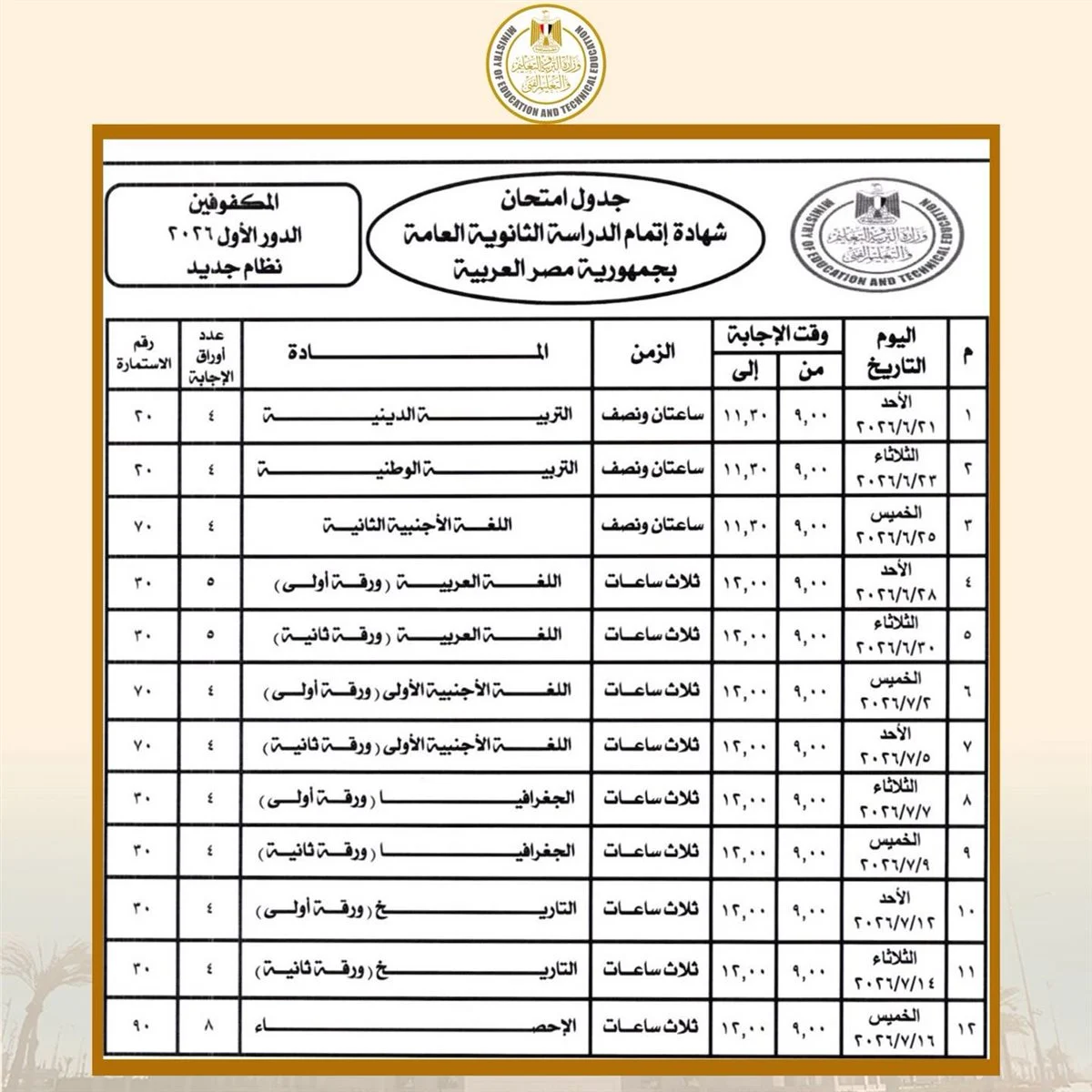جدول امتحانات الثانوية العامة 2026.. المواعيد الكاملة رسميًا