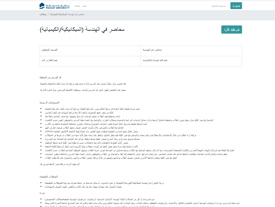 وظيفة جامعة.. أعلنت جامعة مسقط عن فتح باب التقديم لشغل وظيفة محاضر في تخصصات الهندسة، وذلك ضمن خطتها لتطوير العملية التعليمية وتعزيز جودة البرامج الأكاديمية في كلية الهندسة والتكنولوجيا.