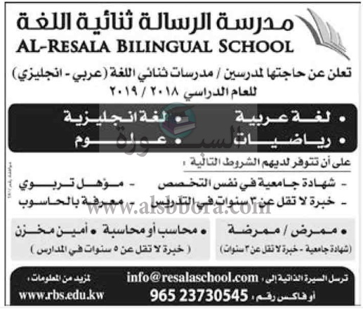 تعلن مدارس الرسالة الكويتية عن وظائف جديدة للمعلمين والمعلمات في مختلف المواد وذلك وفقا لنص الإعلان التالي: