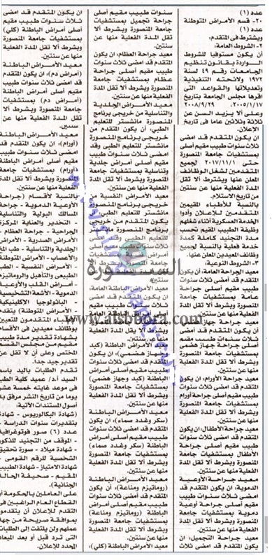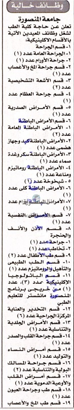 تعلن جامعة المنصورة عن وظائف جديدة لأعضاء هيئة التدريس "من معيد إلي أستاذ "علما بأن أخر موعد للتقديم الإثنين المقبل 5 نوفمبر وفقا لنص الاعلان التالي:-