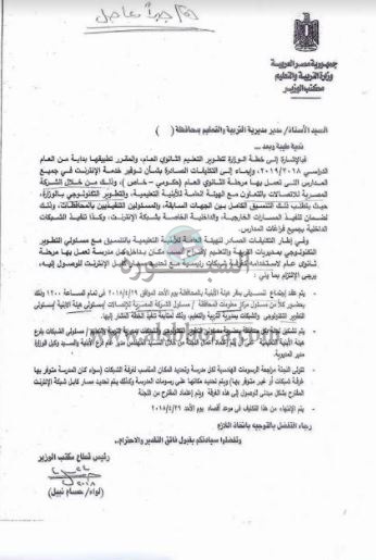 عقد اليوم الخميس رضا الرشيدي وكيل المديرية و القائم بمهام وكيل الوزارة إجتماعاً هاماً مع أعضاء وممثلي الشركة المصرية للإتصالات المهندس هشام القصاص ، والمهندس محمود الشيخ ، وبحضور صلاح عسكر مدير عام التعليم العام بالمديرية و عبد الله عياد مدير عام الشئون التنفيذية بالمديرية ، و هيثم بدران مدير إدارة التطوير التكنولوجي بالمديرية ، وعفت الصياد مدير إدارة التعليم الثانوي العام بالمديرية لمناقشة الخطوات الفعلية لتنفيذ خطة الوزارة لتطوير التعليم الثانوي العام والمقرر تطبيقها بداية من العام الدراسي2019/2018 م .
