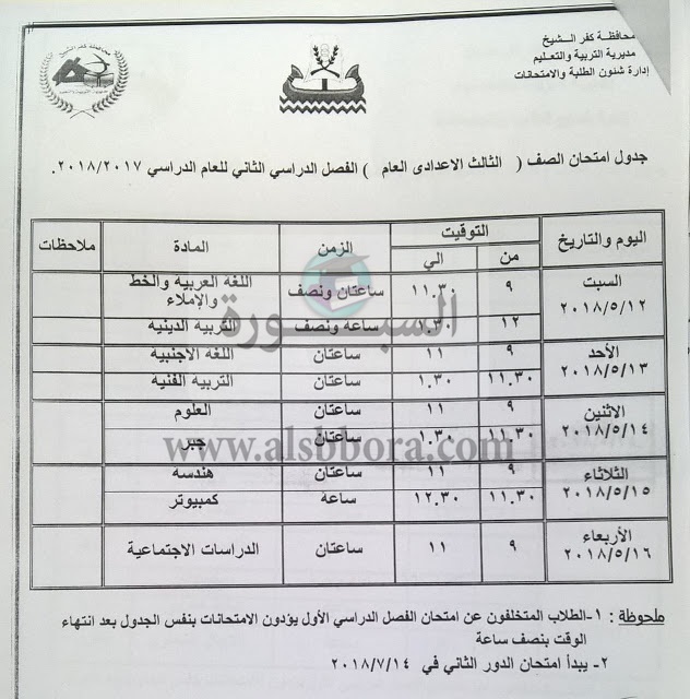 جدول الشهادة الإعدادية بكفر الشيخ على أن يبدأ يوم 12 مايو وينتهى يوم 16 مايو،