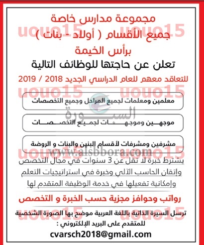 تعلن مدارس رأس الخيمة الإماراتية عن وظائف جديدة للمعلمين والمعلمات في جميع المواد وذلك وفقا لنص الإعلان التالي:-