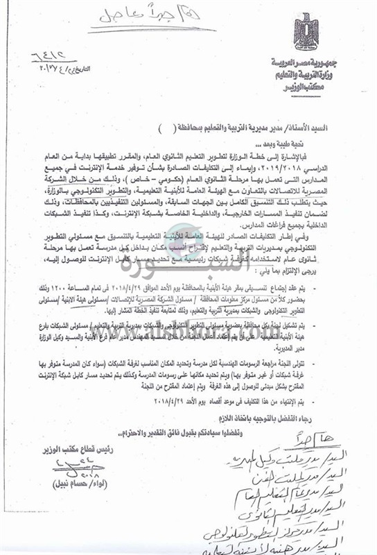 ارسلت وزارة التربية والتعليم والتعليم الفنى خطابا مهما الى جميع المديريات التعليمية بشأن اجتماع يوم الأحد المقبل فى تمام الساعة الثانية عشر ظهرا، بشأن متابعة تطوير خطة توفير خدمة الانترنت فى جميع المدارس التى تعمل بها مرحلة الثانوة العام "حكومى وخاص" وذلك من خلال الشركة المصرية للاتصالات، والتنسيق الكامل بين المسئولين والتنفيذيين بجميع المحافظات.